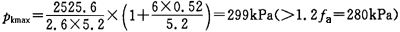 解析 ①按中心荷载初步估计所需的底面积尺寸A0计算地基承载力特征值(先不考虑宽度修正) Ip=0.36-0.23=0.13 IL=(0.3-0.23)=0.54 查《建筑地基基础设计规范》(GB 50007—2002),对e和IL均小于0.85的黏性土,取η(b =0.3,ηd=1.6,得 fa=203+1.6×19×(1.5-0.5)=233.4kPa 则 ②考虑荷载偏心,将面积A0增加30%,即 ιb=10.4×(1+30%)=13.52 m2取基底边长b/ι=2(b为荷载偏心方向边长),故 ιb=2ι2=13.52m2解得ι=2.6m,b=5.2m 验算荷载偏心距 基底处的总竖向力 Fk+Gk=1900+220+20×2.6×5.2×1.5=2525.6kN 基底处的总力矩 Mk=950+180×1.2+220×0.62=1302kN·m 偏心距 验算基底边缘最大压力pkmax,因短边小于3m,故fa=233.4kPa。 调整基底底面尺寸再验算: 取ι=2.7m,b=5.4m(地基承载力特征值不变) Fk+Gk=1900+220+20×2.7×5.4×1.5=2557kN 故确定基础的底面面积 A=2.7×5.4=14.58m