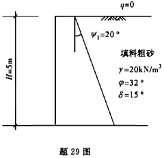 水闸下游岸墙高5m,墙背倾斜与重垂线夹角Ψ1=20°,断面形状如图所示,墙后填料为粗砂,填土表面水平,无超载(q=0),粗砂内摩擦角φ=32°(静动内摩擦...