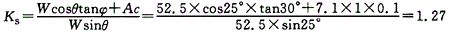 问题 用砂性土填筑的路堤,高度为3.0m,顶宽26m,坡率为1:1.5,采用直线滑动面法验算其边坡稳定性,φ=30°,c=0.1kPa,假设滑动面倾角a=25°,滑动面以上土体重W =52.2kN/m,滑面长L=7.1m,则抗滑动稳定性系数Ks为( )。 A1.17 B1.27 C1.37 D1.47