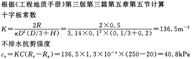 问题 某软土层在某深度处用机械式(开口钢环)十字板剪力仪测得原状土剪损时量表最大读数为250(0.01mm),轴杆与土摩擦时量表读数为20(0.01mm),已知钢环系数为 1.3N/0.01mm,转盘半径为0.5m,十字板头直径为0.1m,高度为0.2m。则该土层不排水抗剪强度为( )kPa。