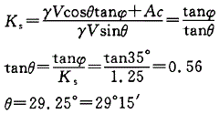 问题 散黏填土土堤边坡高H=4.0m,填料重度γ=20kN/m3,内摩擦角,内聚力c=0,则边坡坡角为( )时边坡稳定性系数为1.25。