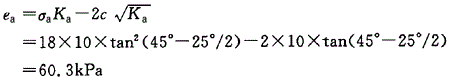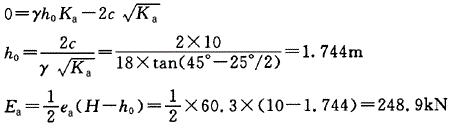 已知基坑开挖深度10m,未见地下水,坑侧无地面超载,坑壁黏性土土性参数如下:重度γ=18kN/m3,黏聚力c=10kPa,内摩擦角。则作用于每延米支护结构...