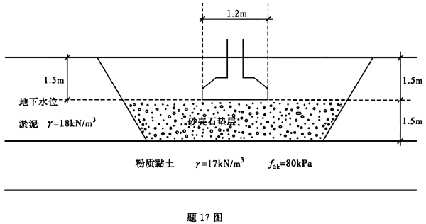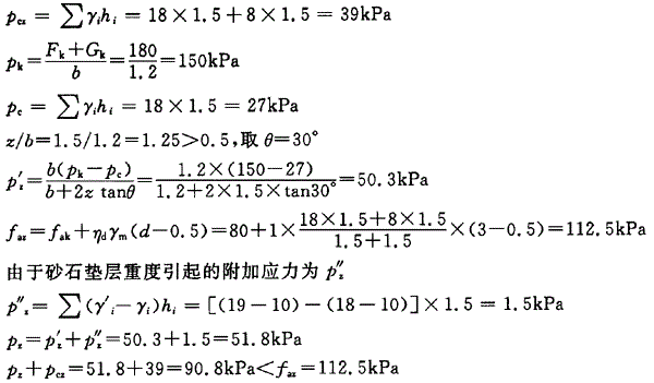 问题 某钢筋混凝土条形基础埋深d=1.5m,基础宽b=1.2m,传至基础底面的竖向荷载Fk+Gk=180kN/m(荷载效应标准组合),土层分布如图所示,用砂夹石将地基中淤泥土全部换填,按《建筑地基处理技术规范》(JGJ 79—2002)验算下卧层承载力,其结果为 ( )。(垫层材料重度γ=19kN/m3) A pz+pPcz<faz B pz+pPcz>faz C pz+pPcz=faz D不确定