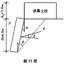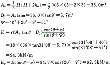 一铁路路堤挡土墙高6.0m,墙背仰斜角a为9°,墙后填土重度γ为18kN/m3,内摩擦角φ为40°,墙背与填料间摩擦角δ为20°,填土破裂角θ为31°08...