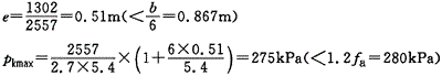 解析 ①按中心荷载初步估计所需的底面积尺寸A0 计算地基承载力特征值(先不考虑宽度修正) Ip=0.36-0.23=0.13 IL=(0.3-0.23)=0.54 查《建筑地基基础设计规范》(GB 50007—2002),对e和IL均小于0.85的黏性土,取η(b =0.3,ηd=1.6,得 fa=203+1.6×19×(1.5-0.5)=233.4kPa 则 ②考虑荷载偏心,将面积A0增加30%,即 ιb=10.4×(1+30%)=13.52 m2 取基底边长b/ι=2(b为荷载偏心方向边长),故 ιb=2ι2=13.52m2 解得ι=2.6m,b=5.2m 验算荷载偏心距 基底处的总竖向力 Fk+Gk=1900+220+20×2.6×5.2×1.5=2525.6kN 基底处的总力矩 Mk=950+180×1.2+220×0.62=1302kN·m 偏心距 验算基底边缘最大压力pkmax,因短边小于3m,故fa=233.4kPa。 调整基底底面尺寸再验算: 取ι=2.7m,b=5.4m(地基承载力特征值不变) Fk+Gk=1900+220+20×2.7×5.4×1.5=2557kN 故确定基础的底面面积 A=2.7×5.4=14.58m2
