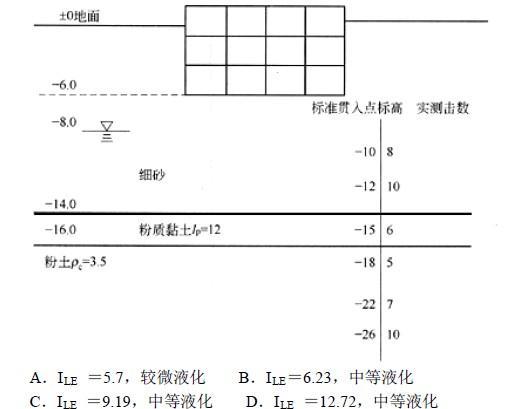 问题 某一高层建筑物箱形基础建于天然地基上,基底标高-6.0m,地下水埋深-8.0m,如图所示:地震设防烈度为8度,基本地震加速度为0.20g,设计地震分组为第一组,为判定液化等级进行标准贯入试验结果如图所示,按《建筑抗震设计规范》(GB 50011 —2001)计算液化指数并划分液化等级,下列()是正确的。