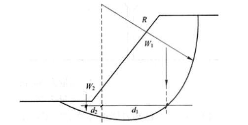 问题 一均匀黏性土填筑的路堤存在如图圆弧形滑面,滑面半径R=12.5m,滑面长L= 25m,滑带土不排水抗剪强度cu=19kPa,内摩擦角Φ=0°,下滑土体重W1=1300kN,抗滑土体重W2=315kN,下滑土体重心至滑动圆弧圆心的距离d1=5.2m,抗滑土体重心至滑动圆弧圆心的距离d2=2.7m,抗滑动稳定系数为()。 A.0.9 B.1.0 C.1.15 D.1.25