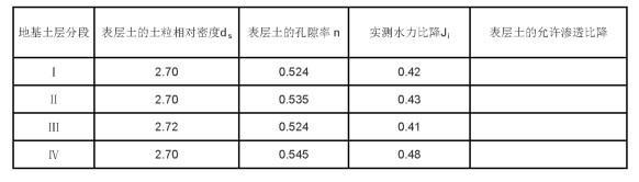 某土石坝坝基表层土的平均渗透系数为K1=10-5cm/s,其下的土层渗透系数为K2=10-3cm/s,坝下游各段的孔隙率如表所列,设计抗渗透变形的安全系数...