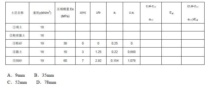 问题 某桩基工程安全等级为二级,其桩型平面布置、剖面及地层分布如图所示,土层物理力学指标及有关计算数据见表。已知作用于桩端平面处的平均有效附加压力为420kPa,沉降计算经验系数Φ=1.1, 地基沉降计算深度至第⑤层顶面,按《建筑桩基技术规范》(JGJ 94-94)验算桩基中心点处最终沉降量, 其计算结果最接近下列哪个选项中的值?()该图同上上题(略)(C0= 0.09,C1= 1.5,C2 = 6.6)