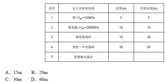 已知某建筑场地土层分布如表所示,为了按《建筑抗震设计规范》(GB 50011 -2001)划分抗震类别,测量土层剪切坡速的钻孔应达到下列哪一选项中的深度即...