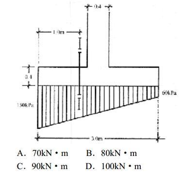 问题 墙下条形基础的剖面见附图,基础宽度6=3m,基础底面净压力分布为梯形,最大边缘压力设计值Pmax= 150kPa,最小边缘压力设计值Pmin= 60kPa,己知验算截面I -I距最大边缘压力端的距离a1 =1.0m,则截面I-I处的弯矩设计值为下列何值?()