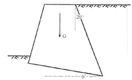 问题 重力式挡土墙的断面如图所示,墙基底倾角6°,墙背面与竖角方向夹角20°,用库仑土压力理论计算得到单位长度的总主动土压力为Ea=200kN/m,墙体单位长度自重300kN/m,墙底与地基土间摩擦系数为0.33,墙背面与土的摩擦角为15°,计算该重力式挡土墙的抗滑稳定安全系数最接近下列哪一选项?() A. 0.50 B. 0.66 C. 1.10 D. 1.20