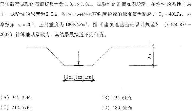 解析 (B) 1.由内摩檫角查得承载力系数分别为Mb =0.51,Md=3.06, Mc=5.66,则对1平方米面积的基础,其地基承载力由下式计算:fu =0.51 x1x 18 +5.66 x40 =9. 13 +226.4 = 235. 6kPa 2.这里的考核点对载荷试验埋置深度的理解,载荷试验的埋深应为零,如以2m为例,则得345. 8kPa的错误结果。