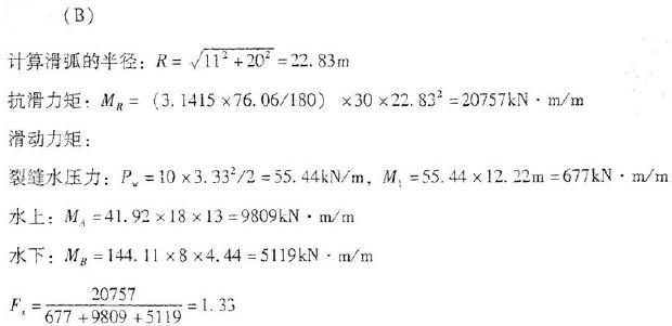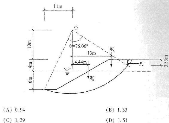 问题 饱和软粘土坡度为1: 2,坡高10m,不排水抗剪强度Cu = 30kPa,土的天然容重为13kN/m3,水位在坡脚以上6m,已知单位土坡长度滑坡体水位以下土体体积VB= 144. 11m3/m,与滑动圆孤的圆心距离为dB=4. 44m,在滑坡体上部有3. 33m的拉裂缝,缝中充满水,水压力为pw,滑坡体水位以上的体积VA=41.92m3/m,圆心距为dA = 13m,用整体圆孤法计算土坡沿着该滑裂面滑动的安全系数最接近于下列哪个数值?