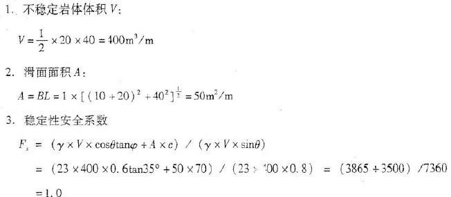 某很长的岩质边坡受一组节理控制,节理走向与边坡走向平行,地表出露线距边坡顶边緣线20m,坡顶水平,节理面与坡面交线和坡顶的高差为40m,与坡顶的水平距离1...