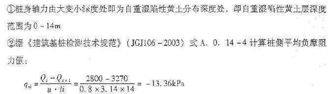某自重湿陷性黄土场地混凝土灌注桩径为800mm,桩长为34m,通过浸水载荷试验和应力测试得到桩费轴力在极限荷载下(2800kN)的数据及曲线图如下,此时桩...