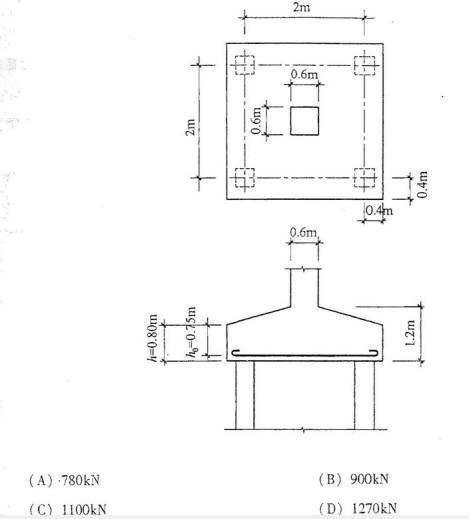 如图所示四桩承台,采用截面0.4m x 0.4m钢筋混凝土预制方桩,承台混凝土强度等级为C35(fa=1.57MPa),按《建筑桩基技术规范》(JGJ94...
