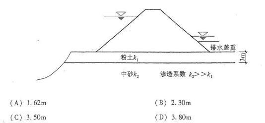 问题 某土坝坝基有两层土组成,上层土为粉土,孔隙比0.667,比重2.67,层厚3.0m,第二层土为中砂,土石坝上下游水头差为3.0m,为保证坝基的渗透稳定,下游拟采用排水盖重层措施,如安全系数取2.0,根据《碾压土石坝设计规范》(SL274-2001),排水盖重层(其重度18.5kN/m3)的厚度最接近下列哪一个数值?