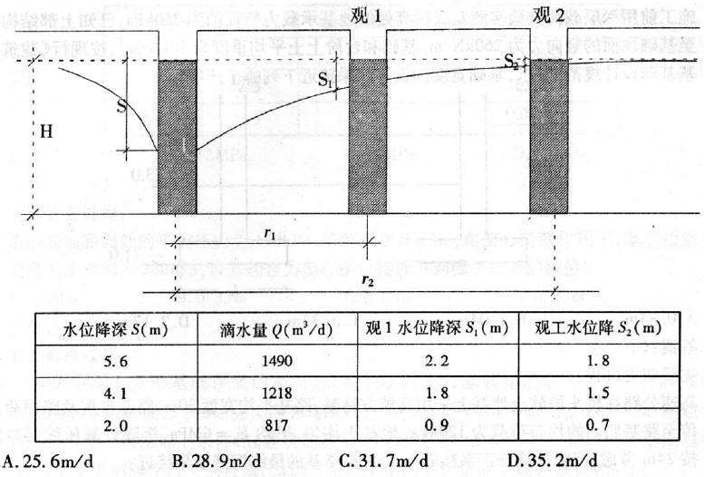 问题 为求取有关水文地质参数,带两个观察孔的潜水完整井,进行3次降深抽水试验,其地层和井壁结构如图所示,已知H=15. 8m;r1=10.6m;r2=20.5m;抽水试验成果见下表,问渗透系数k最接近如下选项?
