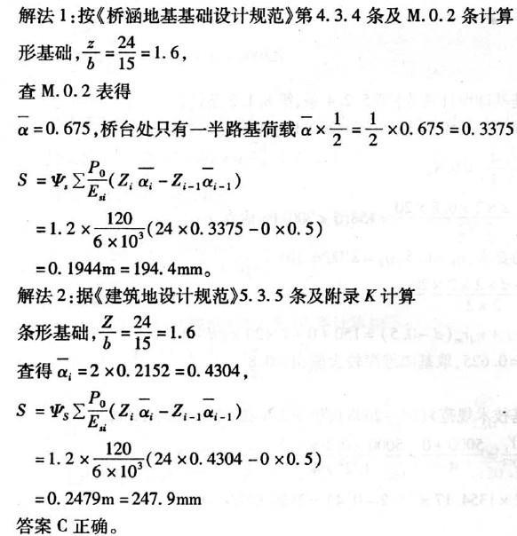 问题 高速公路在桥头段软土地基上采用高填方路基,路基平均宽度30m,路基自重及路面荷载传至路基底面的均布荷载为120kPa,地基土均匀,平均Es=6MPa,沉降计算压缩层厚度按24m考虑,沉降计算修正系数取1. 2,桥头路基的最终沉降量最接近? A. 124mm B. 248mm C. 206mm D. 495mm