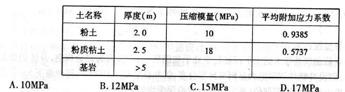 天然地基上的独立基础,基础平面尺寸5m x5m,基底附加压力180kPa,基础下地基土的性质和平均附加应力系数见下表,问地基压缩层的压缩模量当量值最接近下...