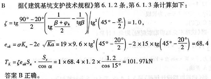 问题 墙面垂直的土钉墙边坡,土钉与水平面夹角为15°,土钉的水平与竖直间距都是1.2m。 墙后地基土的c = 15kPa,φ=20°,γ = 19kN/m3,无地面超载。在9. 6m深度处的每根土钉的轴向受拉荷载最接近于下列哪个选项? A.98kN B. 102kN C. 139kN D.208kN