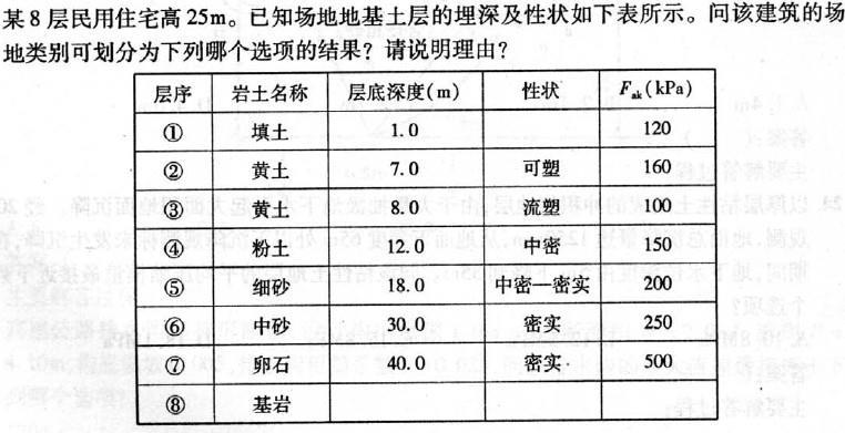 解析 据《建筑抗震设计规范》4. 1. 2条,4.1. 3条,4. 1.4条,4. 1. 6条计算如下: ①覆盖层厚度为30m,取Vse计算深度为20m。 ②除①③层为软弱之外,20m范围内均为中软土,Vse应在140 - 250m/s之间。 ③场地应为Ⅱ类 答案A正确。