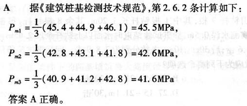 某钻孔灌注桩,桩长15m,采用钻芯法对桩身混凝土强度进行检测,共采取3组芯样,试件抗压强度(单位MPa)分别为:第一组45.4、44. 9、46. 1 ;...