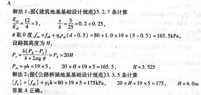 问题 高速公路连接线路平均宽度25m,硬壳层厚5.0m,fak=180kPa,Es= 12MPa,重度γ=19kN/m3,下卧淤泥质土,fak=80kPa,Es=4MPa,路基重度20kN/m3,在充分利用硬壳层,满足强度条件下的路基填筑最大高度最接近下列哪个选项? A. 4.0m B. 8.7m C.9.0m D. 11.0m