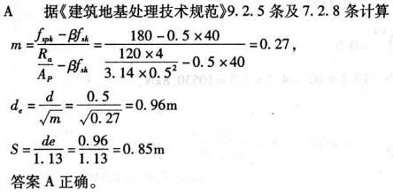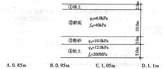 某软土地基土层分布和各土层参数如图所示,巳知基础埋深为2.0m,采用搅拌桩复合地基,搅拌桩长10.0m,桩直径500mm,单桩承载力为120kN,要使复合...