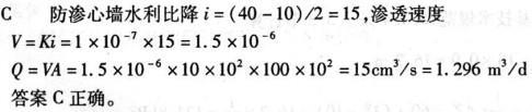 问题 土坝因坝基渗漏严重,拟在坝顶釆用旋喷粧技术做一道沿坝轴方向的垂直防渗心墙,墙身伸到坝基下伏的不透水层中。已知坝基基底为砂土层,厚度10m,沿坝轴长度为100m,旋喷桩墙体的渗透系数为1x10-7cm/s,墙宽2m,问当上游水位高度40m,下游水位高度10m时,加固后该土石坝坝基的渗漏量最接近下列哪个数值(不考虑土坝坝身的渗漏量)? A. 0.9m3/d B. 1.1m3/d C.1.3m3/d D. 1.5m3/d