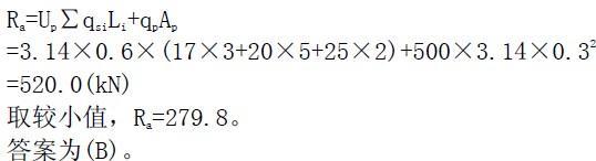 解析 据:①《面授班辅导讲义》第四十讲。 ②《建筑地基处理技术规范》(JGJ 79—2002)第12. 2. 3条。 (1)按桩身材料计算的单桩竖向承载力特征值艮为: R = ηfcuAp=0.33 X 3 X 103 X 3. 14 X 0 . 32=2 79 . 8 (kN) (2)按桩周土的强度计算的单桩竖向承载力特征值Ra,