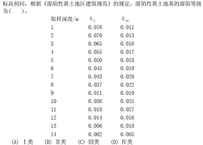 陇西地区某湿陷性黄土场地的地层情况为:0~12.5 m为湿陷性黄土,12.5 m 以下为非湿陷性土。探井资料如表,假设场地地层水平,均匀,地面标高与±0....