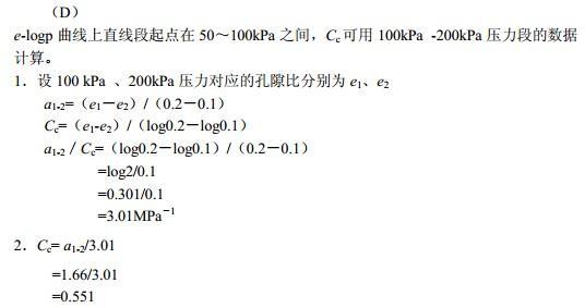 问题 已知某地区淤泥土标准固结试验e-logp曲线上直线段起点在50?100kPa之间,该地区某淤泥土样测得100?200kPa压力段压缩系数a1-2为1.66MPa-1,试问其压缩指数Cc值最接近于下列何项数值? (A) 0.40 (B) 0.45 (C) 0.50 (D) 0.55