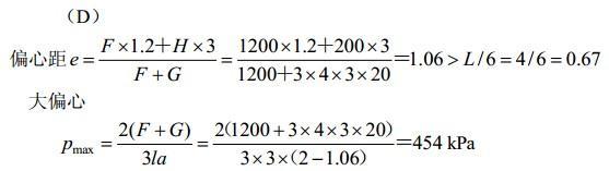 问题 某构筑物其基础底面尺寸为3mX4m,埋深为3m,基础及其上土的平均重度为20kN/m3,构筑物传至基础顶面的偏心荷载Fk=1200kN,距基底中心1.2m,水平荷载Hk=200kN,作用位置如图所示。试问,基础底面边缘的最大压力值pkmax,与下列何项数值最为接近? (A) 265kPa (B) 341kPa (C) 415kPa (D) 454kPa