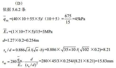 问题 某软土地基上多层建筑,采用减沉复合疏桩基础,筏板平面尺寸为35mX10m,承台底设置钢筋混凝土预制方桩共计102根,桩截面尺寸为200mmX 200mm,间距2m,桩长15m,正三角形布置,地层分布及土层参数如图所示,试问按《建筑桩基技术规范》(JGJ 94-2008)计算的基础中心点由桩土相互作用产生的沉降Ssp,其值与下列何项数值最为接近?