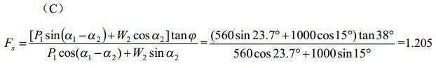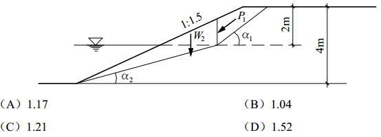 问题 有一部分浸水的砂土坡,坡率为1:1.5,坡高4m,水位在2m处;水上、水下的砂土的内摩擦角均为φ=38°;水上砂土重度γ=18kN/m3,水下砂土饱和重度γsat=20kN/m3。用传递系数法计算沿图示的折线滑动面滑动的安全系数最接近于下列何项数值?(已知W2=1000kN,P1=560kN,α1=38.7°,α2=15.0°,P1为第一块传递到第二块上的推力,W2为第二块已扣除浮力的自重)