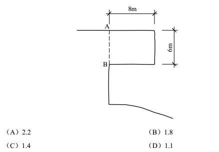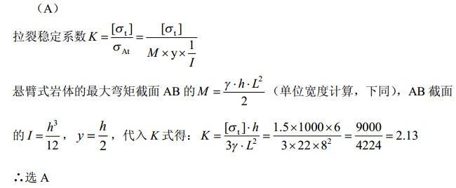 问题 一悬崖上突出一矩形截面的完整岩体(如图),长L为8m,厚(高)h为6m,重度γ为22kN/m3,允许抗拉强度[σt]为1.5MPa,试问该岩体拉裂崩塌的稳定系数最接近于下列何项数值?