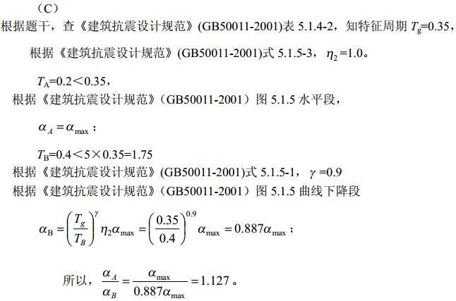 问题 某场地抗震设防烈度为8度,场地类别为II类,设计地震分组为第一组,建筑物A和建筑物B的结构基本自振周期分别为:TA=0.2s和TB=0.4s,阻尼比均为ζ=0.05。根据《建筑抗震设计规范》(GB50011-2001)(2008版),如果建筑物A和B的相应于结构基本自振周期的水平地震影响系数分别以αA和αB表示,试问两者的比值(αA/αB) 最接近于下列何项数值? (A) 0.83 (B) 1.23 (C) 1.13 (D) 2.13
