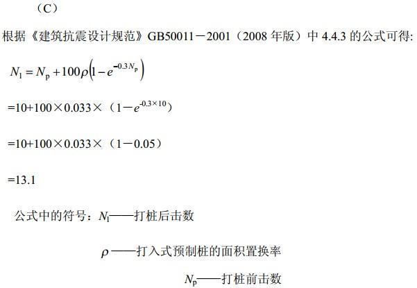 问题 在存在液化土层的地基中的低承台群桩基础,若打桩前该液化土层的标准贯入锤击数为10击,打入式预制桩的面积置换率为3.3%,按照《建筑抗震设计规范》(GB50011-2001)(2008年版)计算,试问打桩后桩间土的标准贯入试验锤击数最接近于下列何项数值? (A) 10 击 (B) 18 击 (C) 13 击 (D) 30 击
