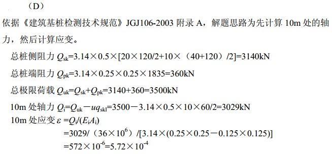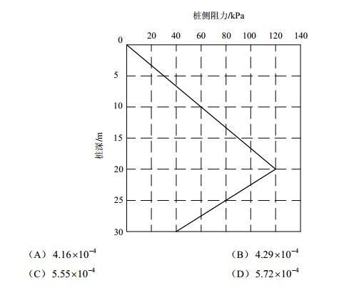问题 某PHC管桩,桩径500mm,壁厚125mm,桩长30m,桩身混凝土弹性模量为36X106kPa(视为常量),桩底用钢板封口,对其进行单桩静载试验并进行桩身内力测试。根据实测资料,在极限荷载作用下,桩端阻力为1835kPa,桩侧阻力如下图所示。试问该PHC管桩在极限荷载条件下,桩顶面下10m处的桩身应变最接近于下列何项数值?