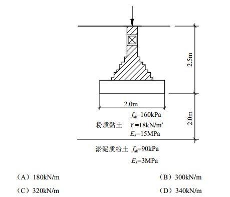 问题 某老建筑物采用条形基础,宽度2.0m,埋深2.5m,拟增层改造,探明基底以下2.0m 深处下卧淤泥质粉土,fak=90kPa,Es=3MPa。如图所示,已知上层土的重度为18kN/m3, 基础及其上土的平均重度为20kN/m3。地基承载力特征值fak=160kPa,无地下水,试问,基础顶面所允许的最大竖向力Fk与下列何项数值最为接近?