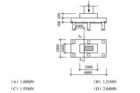 问题 柱下桩基承台,承台混凝土轴心抗拉强度设计值ft=1.71MPa,试按《建筑桩基技术规范》(JGJ94-2008),计算承台柱边A1-A1斜截面的受剪承载力,其值与下列何项数值最为接近?(图中尺寸单位为mm。)
