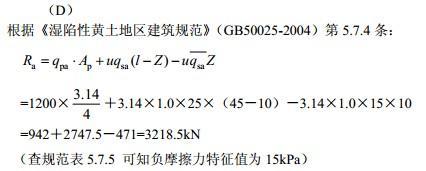 问题 某单层湿陷性黄土场地,黄土的厚度为10m,该层黄土的自重湿陷量计算值Δzs = 300mm。在该场地上拟建建筑物拟采用钻孔灌注桩基础,桩长45m,桩径1000mm,桩端土的承载力特征值为1200kPa,黄土以下的桩周土的摩擦力特征值为25kPa,根据《湿陷性黄土地区建筑规范》(GB50025-2004)估算该单桩竖向承载力特征值最接近下列哪一选项? (A) 4474.5kN (B) 3689.5kN (C) 3061.5kN (D) 3218.5kN