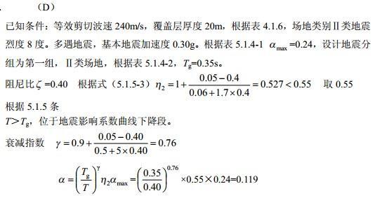已知某建筑场地抗震设防烈度为8度,设计基本地震加速度为0.30g。设计地震分组为第一组。场地覆盖层厚度为20m,等效剪切波速为240m/s,结构自振周期为...