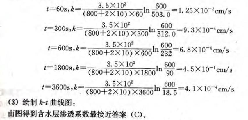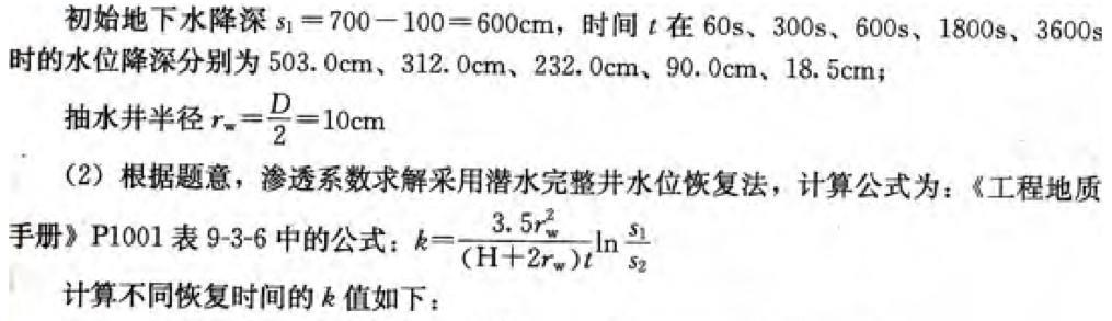 问题 某工程进行现场水文地质实验,已知潜水含水层底板埋深为9.0m,设置潜水完整井,井径D=200mm,实测地下水位埋深1.0,抽水至水位埋深7. 0m后让水位自由恢复,不同恢复时间实测得到的地下水位如下:则估算的地层渗透系数最接近以下哪个数值? (A) 1. 3×10﹣3 cm/s (B)1.8 ×10﹣4 cm/s (C)4.0× 10﹣4 cm/s (D) 5.2×10﹣4 cm/s