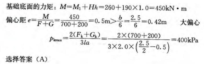 问题 图示柱下钢筋混凝土独立基础,底面尺寸为2. 5m×2.0m,基础埋深为2m,上部结构传至基础顶面的竖向荷栽F为700kN,某础及其上土的平均重度为20kN/m3,作用于基础底面的力矩M为260kN . m,距基底1m处作用水平荷栽H为190kN。该基础底面的好大压力与下列哪个数值最接近? (A) 400kPa (B) 396kPa (C) 213kPa (D) 180kPa