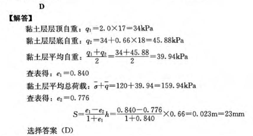 问题 大面积料场场区地层分布及参数如图所示。②运黏土的压缩试验结果见下表,地表堆载120kPa,则在此荷载作用下,黏士层的压缩量与下列哪个数值最接近? (A) 46mm (B) 35mm (C) 28mm (D) 23mm