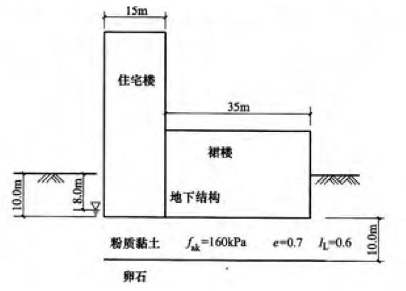 某岛层住宅楼裙楼的地下结构相互连接,均采用筏板基础,基底埋深为室外地面下10.0m。主楼住宅楼基底平均压力=260kPa,裙楼基底平均压力=90kPa,土...