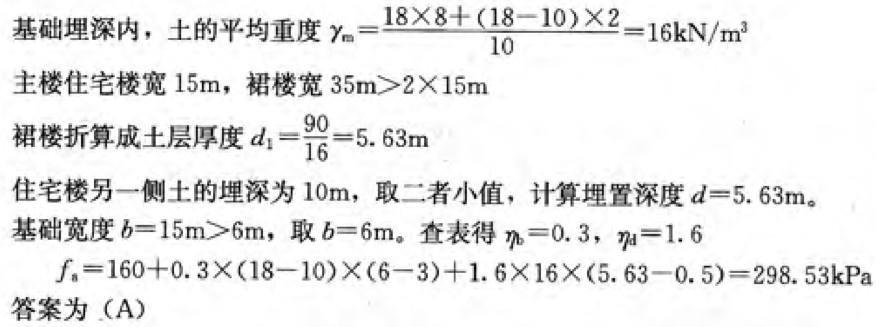 问题 某岛层住宅楼裙楼的地下结构相互连接,均采用筏板基础,基底埋深为室外地面下10.0m。主楼住宅楼基底平均压力=260kPa,裙楼基底平均压力=90kPa,土 的重度为18kN/m3,地下水位埋深8.0m,住宅楼与裙楼长度方向均为50m,其余指标如图所示,试计算修正后住宅楼地某承栽力特征值最接近下列哪个选项? (A) 299kPa (B) 307kPa (C) 319kPa (D) 410kPa
